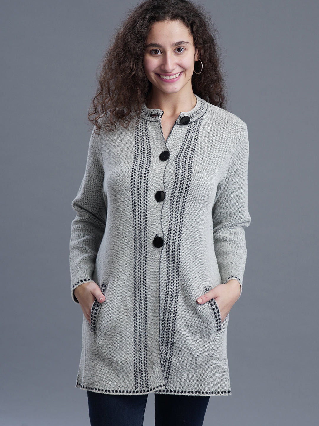 Stay Effortlessly Stylish In This Premium Nylon Wool Long Cardigan. With Intricate Jacquard Detailing, Round Neck, Full Sleeves, And A Half-Button Front, It'S Your Perfect Companion For Casual, Semi-Formal, And Evening Winter Wear.