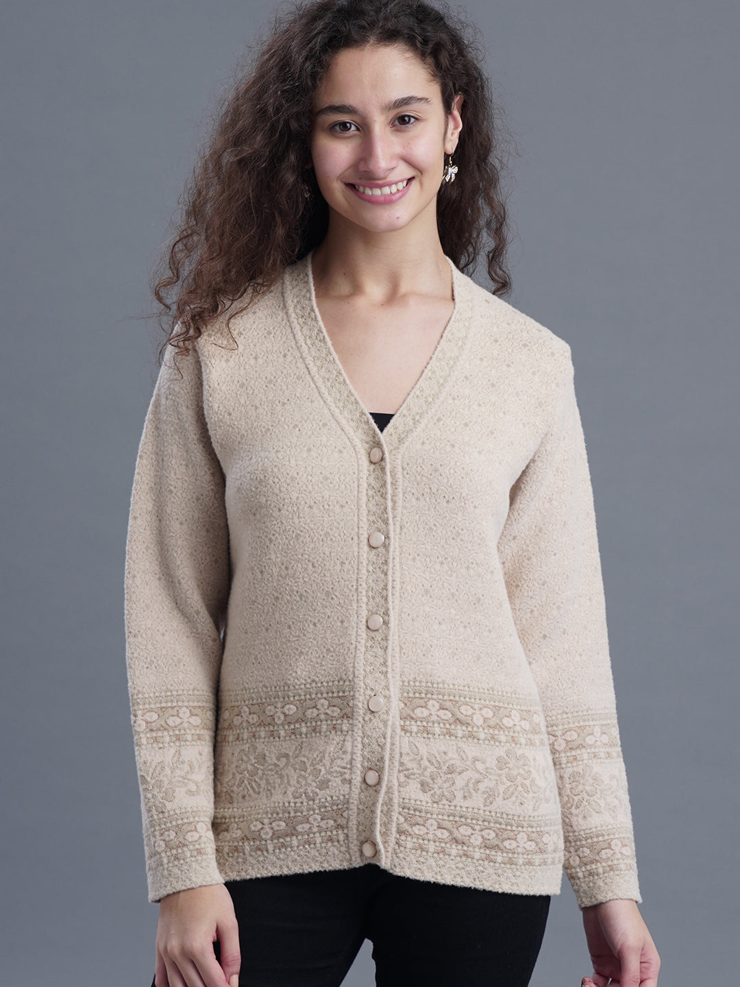Designed For Winter Elegance, This V-Neck Cardigan Is Made From A Premium Nylon-Wool Blend With A Rich Jacquard Knit. Featuring A Full-Button Closure, Full Sleeves, And A Regular Fit, It'S The Perfect Party Wear Essential To Keep You Stylish And Warm.