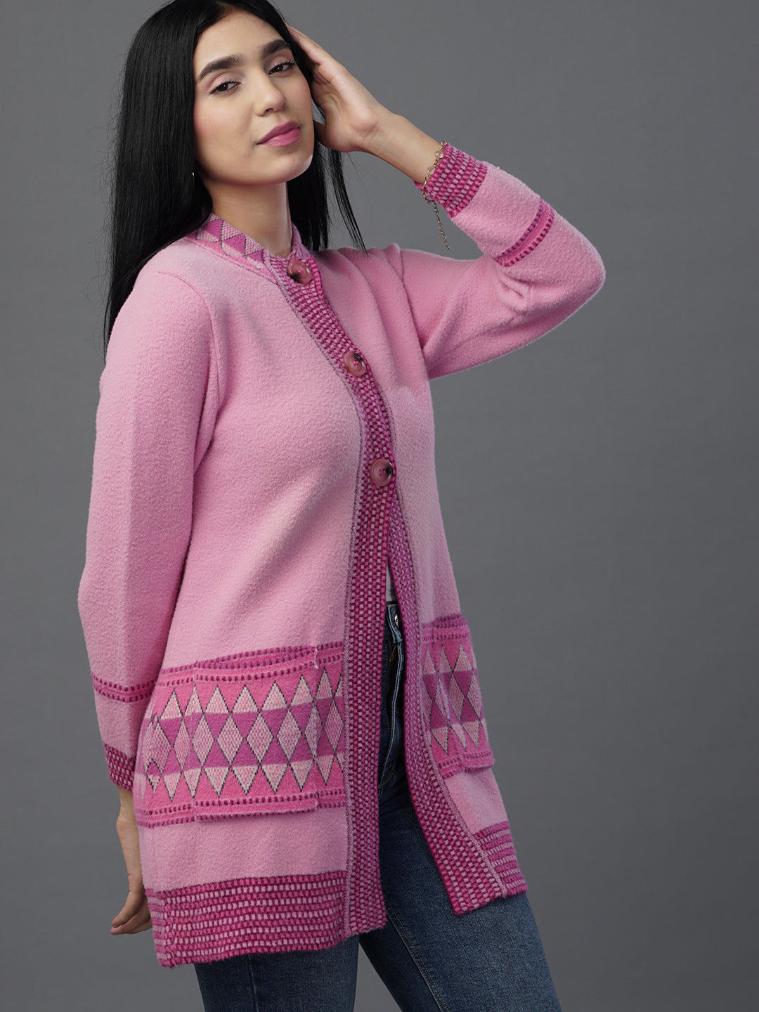 Soft, feminine, and undeniably cozy, this pink jacquard cardigan brings a gentle glow to cold winter mornings. Its V-neck silhouette and delicate self-design make it a versatile layer for both professional and social settings.