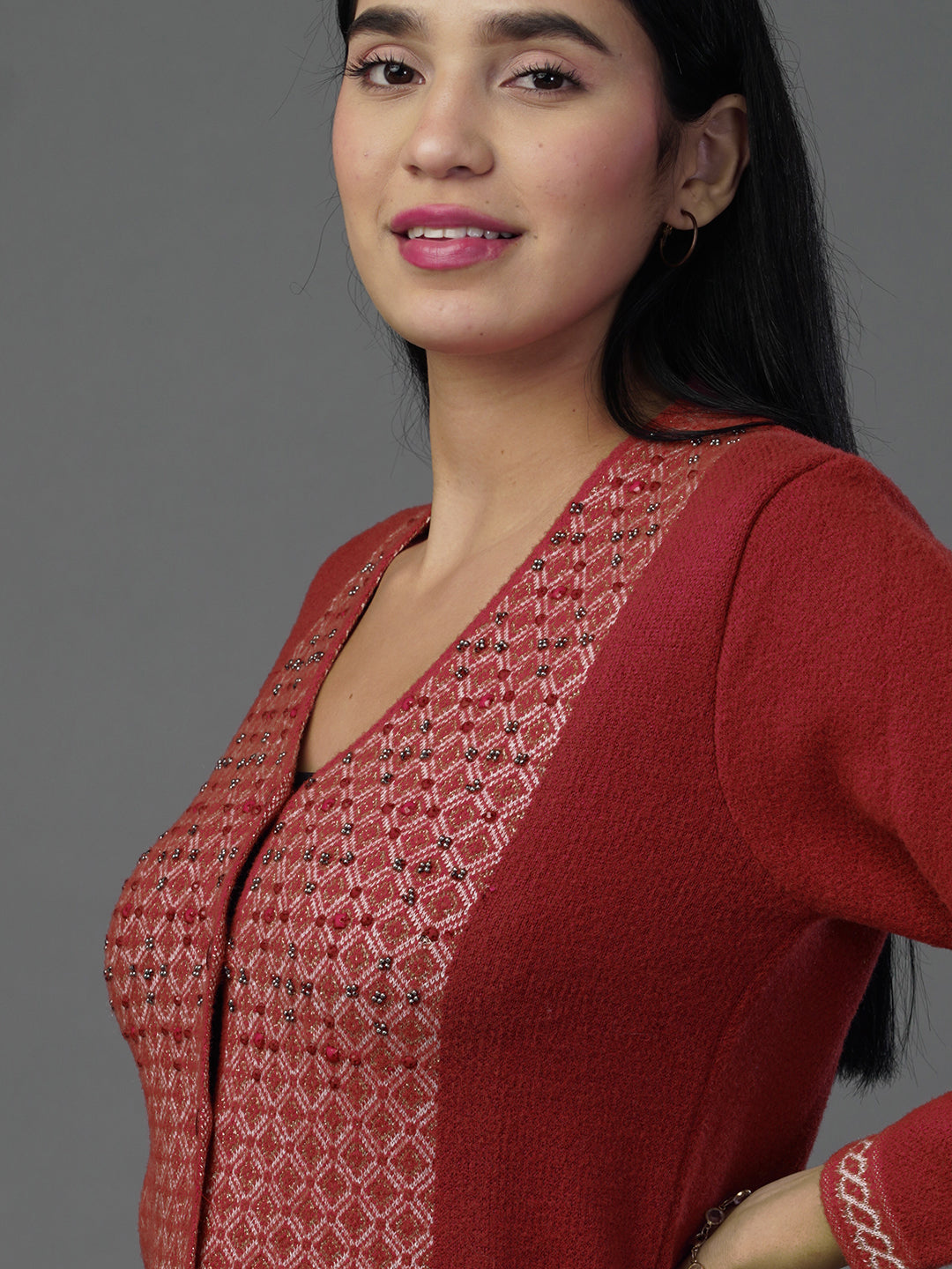 Wrap yourself in the rich, wine-inspired tones of our Maroon Jacquard Cardigan, a piece that exudes effortless grace. Designed with a full button front, it offers versatile styling options for both casual outings and cozy evenings.