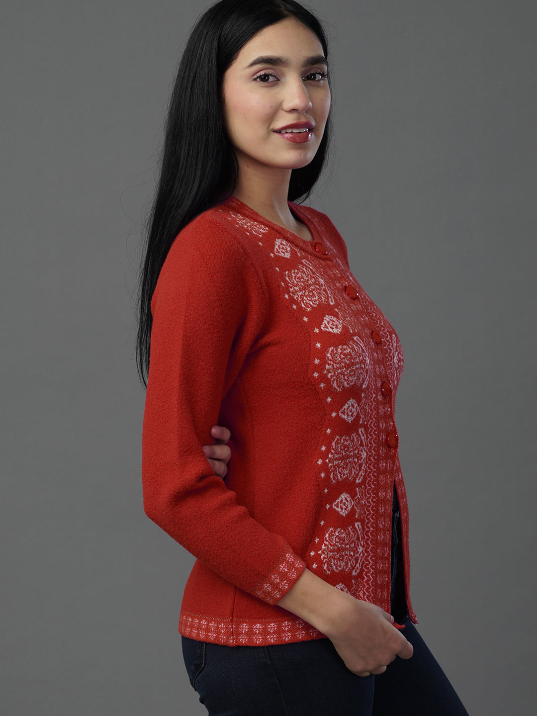 Make a confident statement in our Crimson Fire cardigan, a vibrant red layer that commands attention. This piece is meticulously crafted to ensure you stay warm while looking impeccably sharp throughout the season.
