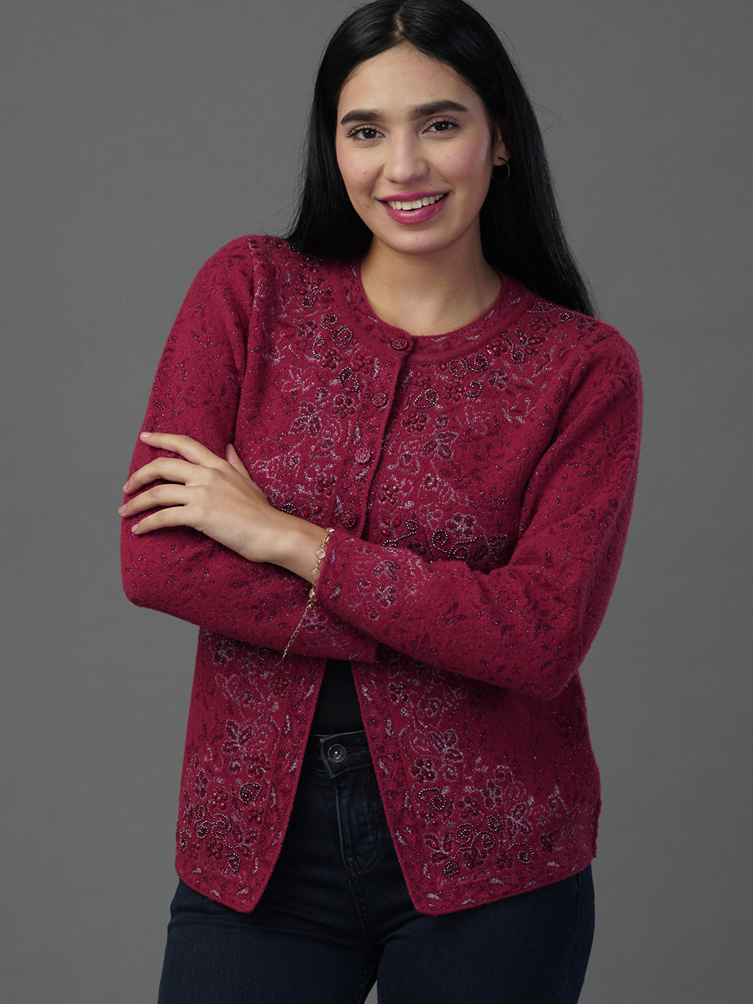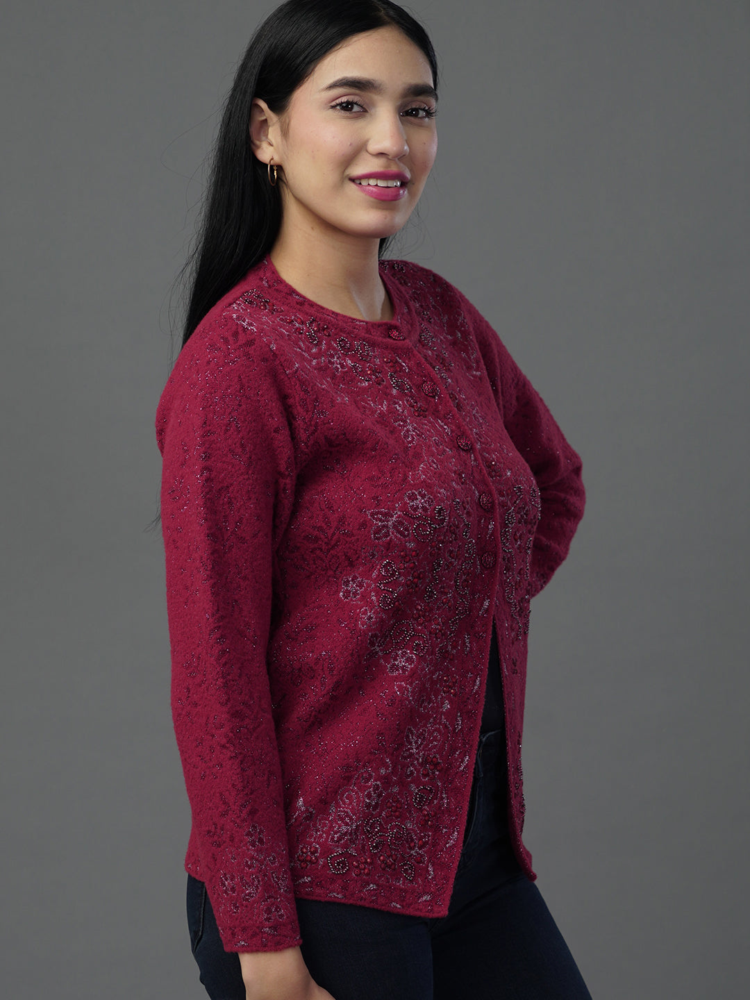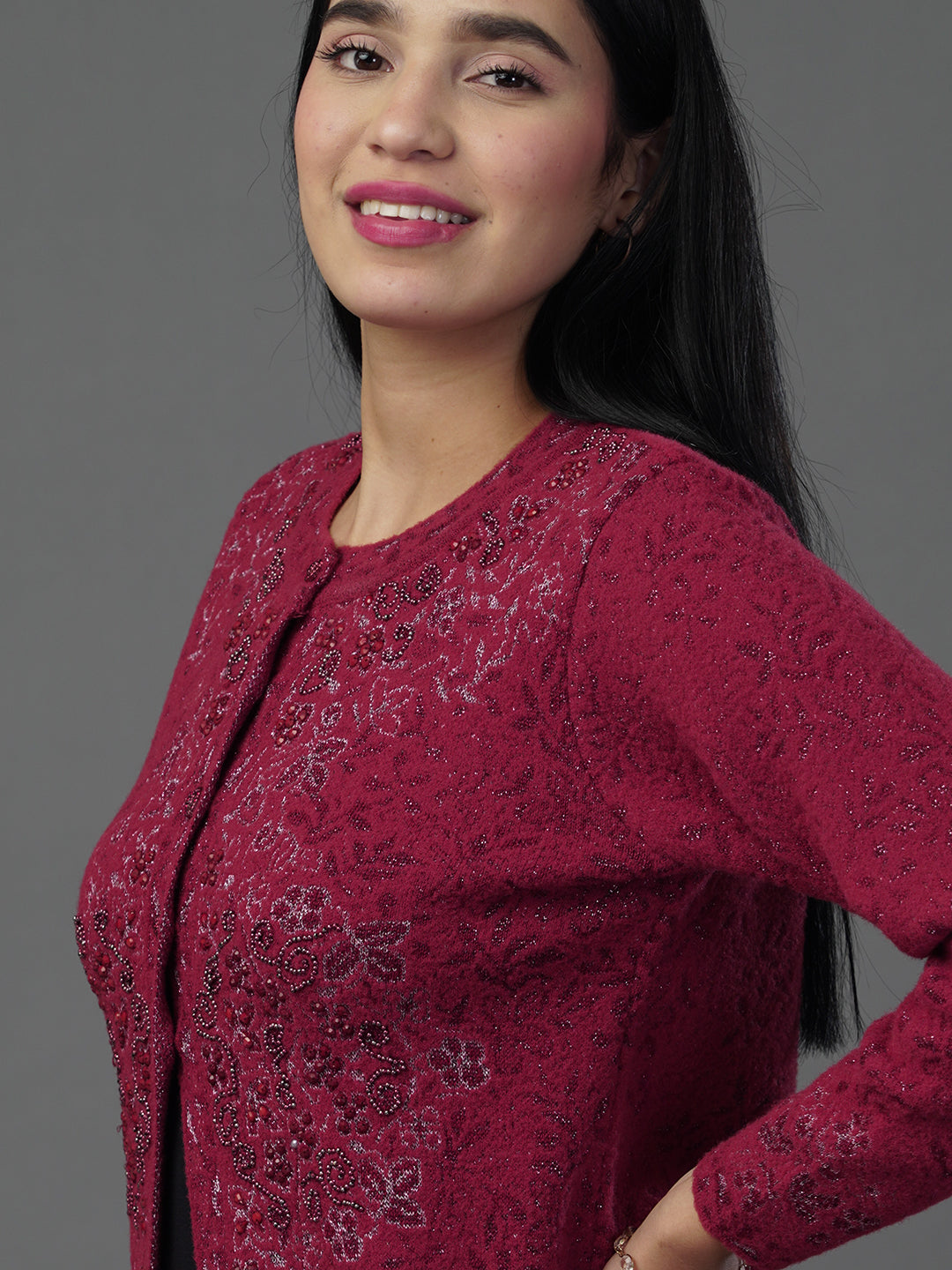 Celebrate the richness of winter with our collection of deep maroon cardigans. Whether you prefer the classic V-neck or the structured Round-neck, these pieces feature intricate jacquard textures that make them a cornerstone of any formal winter wardrobe.