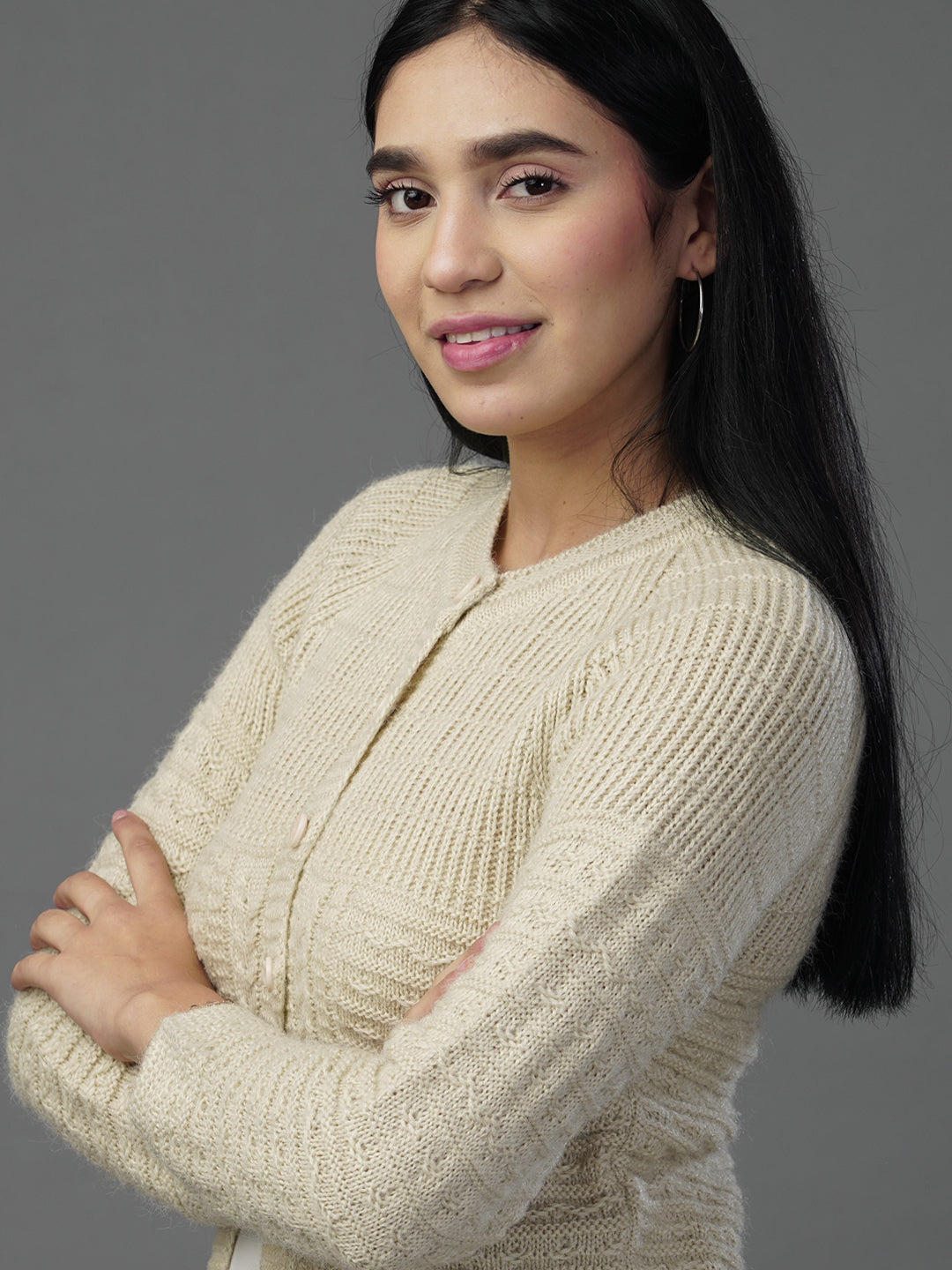 Soft, airy, and undeniably graceful, the Ivory Cream Cardigan is the epitome of feminine knitwear. Its delicate self-design offers a light-reflecting quality that brightens your complexion and your outfit.
