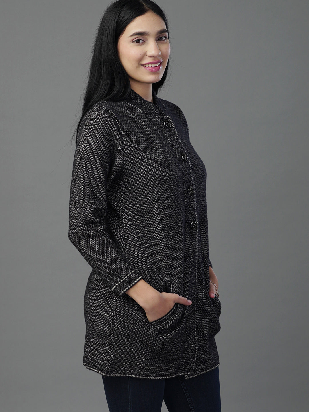 A classic black cardigan is elevated to luxury status with an intricate tonal jacquard weave. This piece offers a sleek, slimming silhouette that provides a sharp finish to any ensemble while keeping the winter chill at bay.