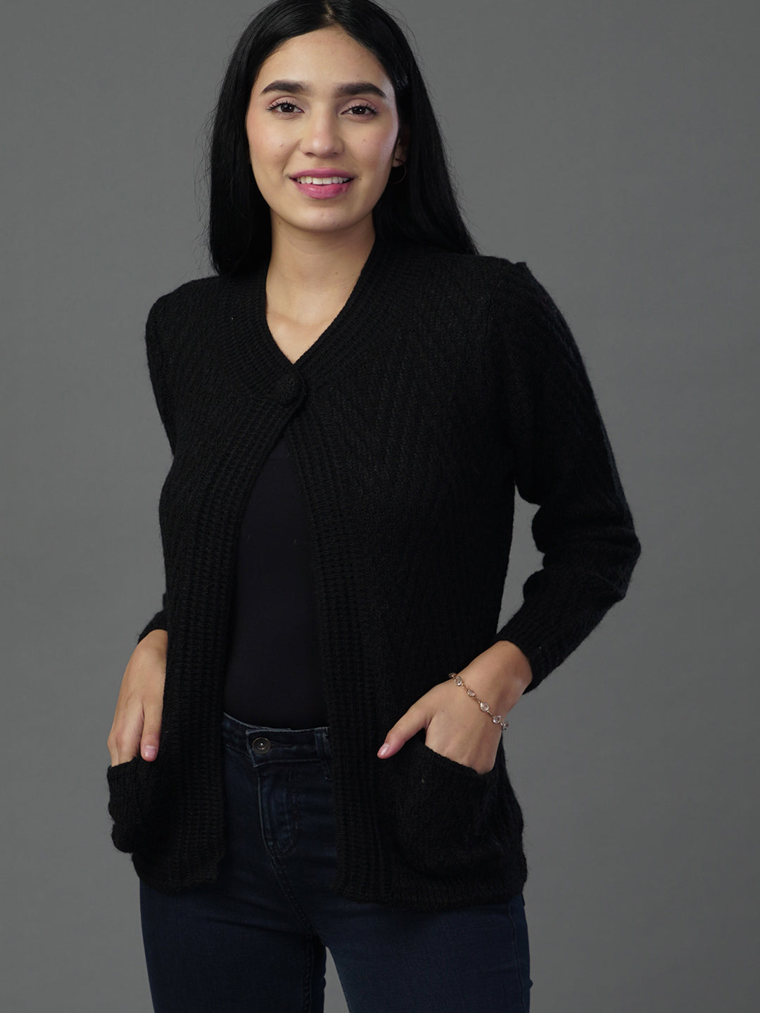 Sophistication meets cozy warmth in this deep black cardigan, featuring a subtle self-design that catches the light beautifully. It’s the quintessential winter essential for the modern woman who values both style and comfort.