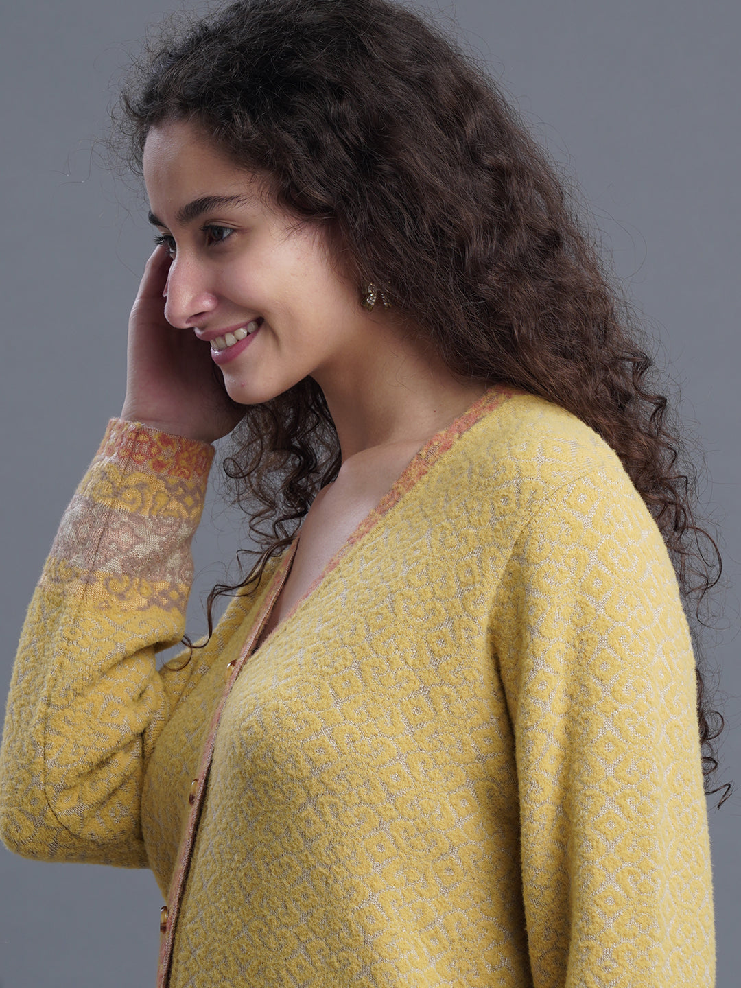 Elevate Your Winter Wardrobe With This Elegant V-Neck Cardigan, Crafted In A Premium Nylon-Wool Blend. Featuring An Intricate Jacquard Design And Full Button Closure, It Offers A Regular Fit And Is Ideal For Party Occasions.