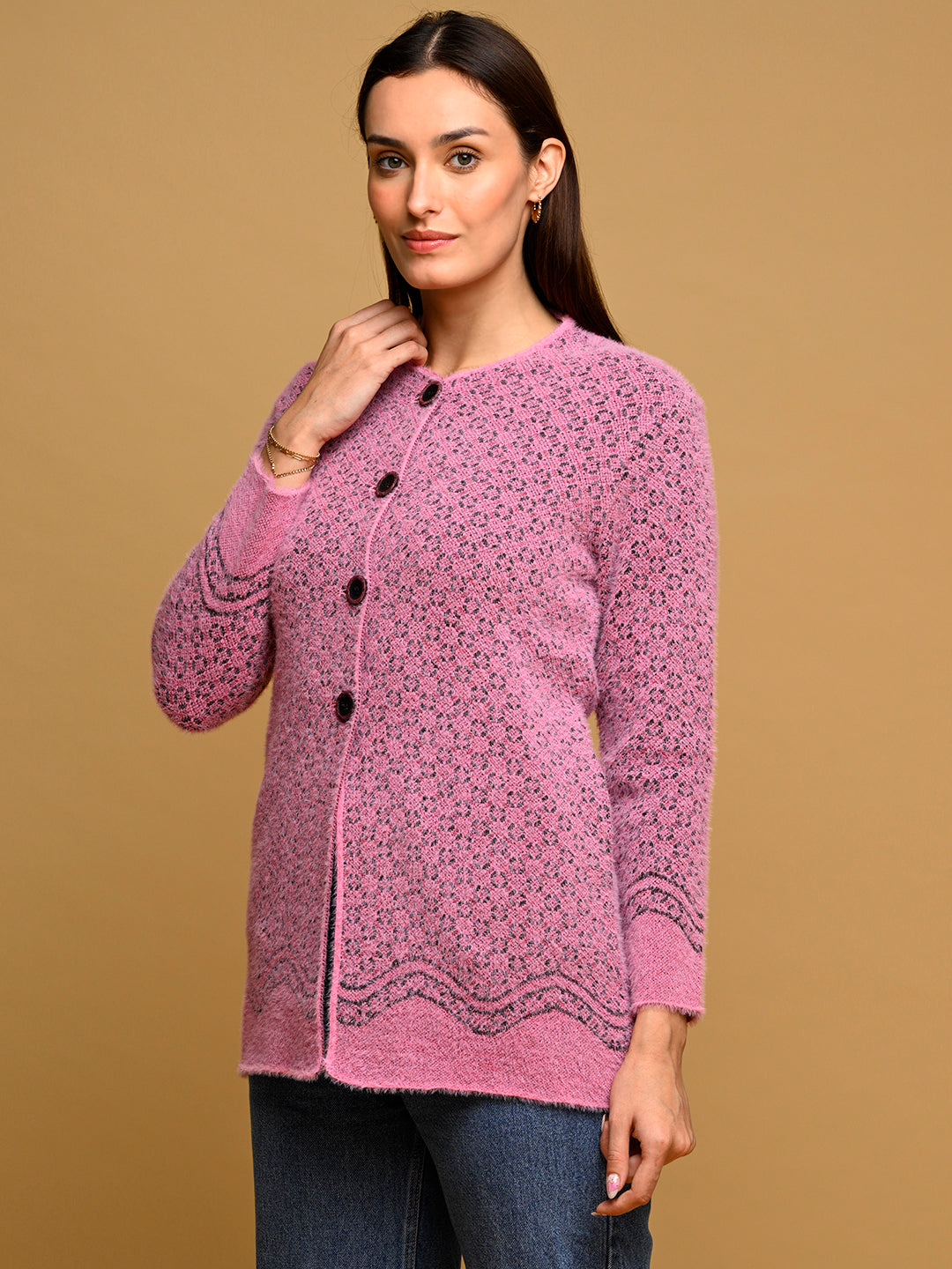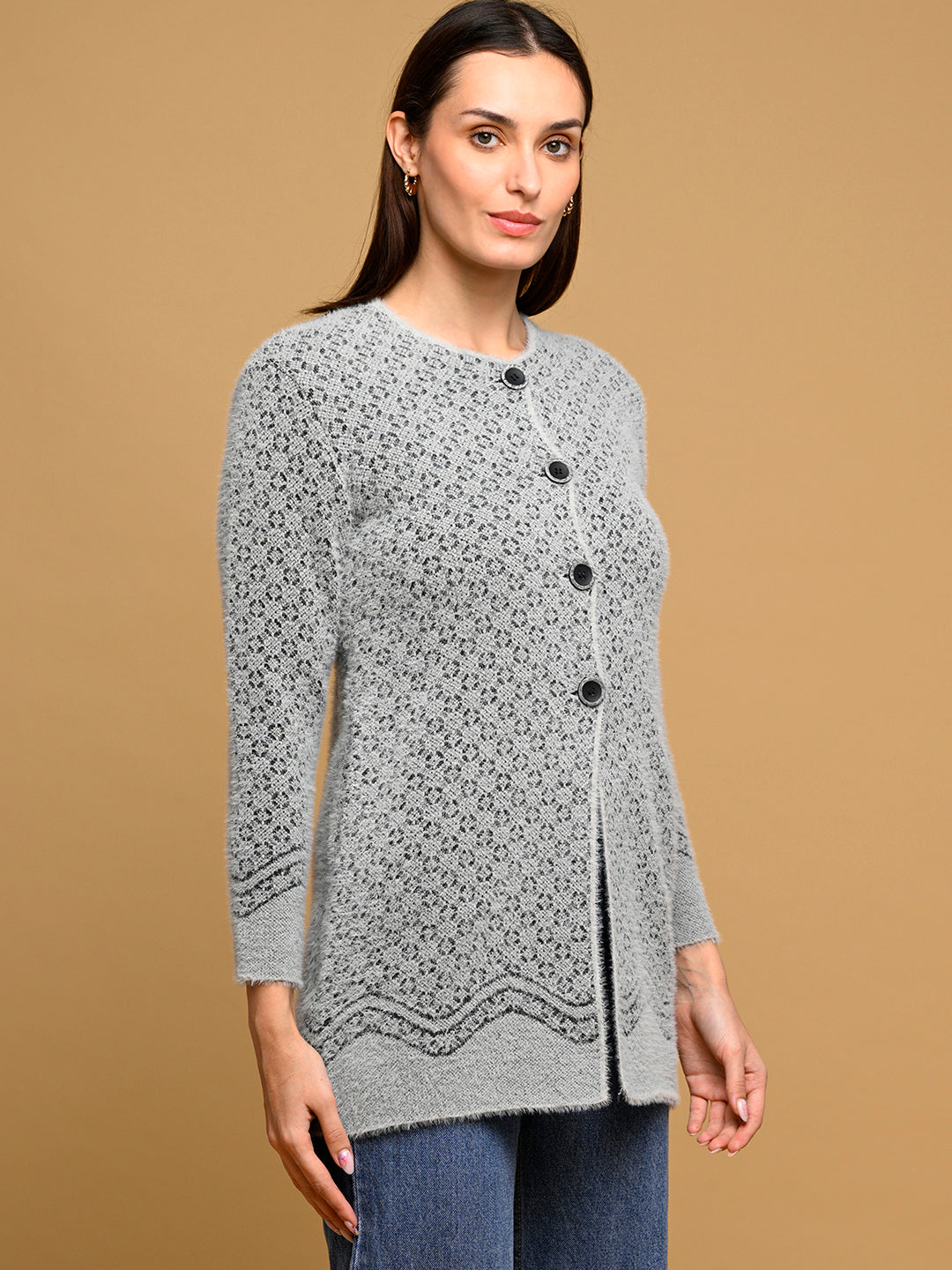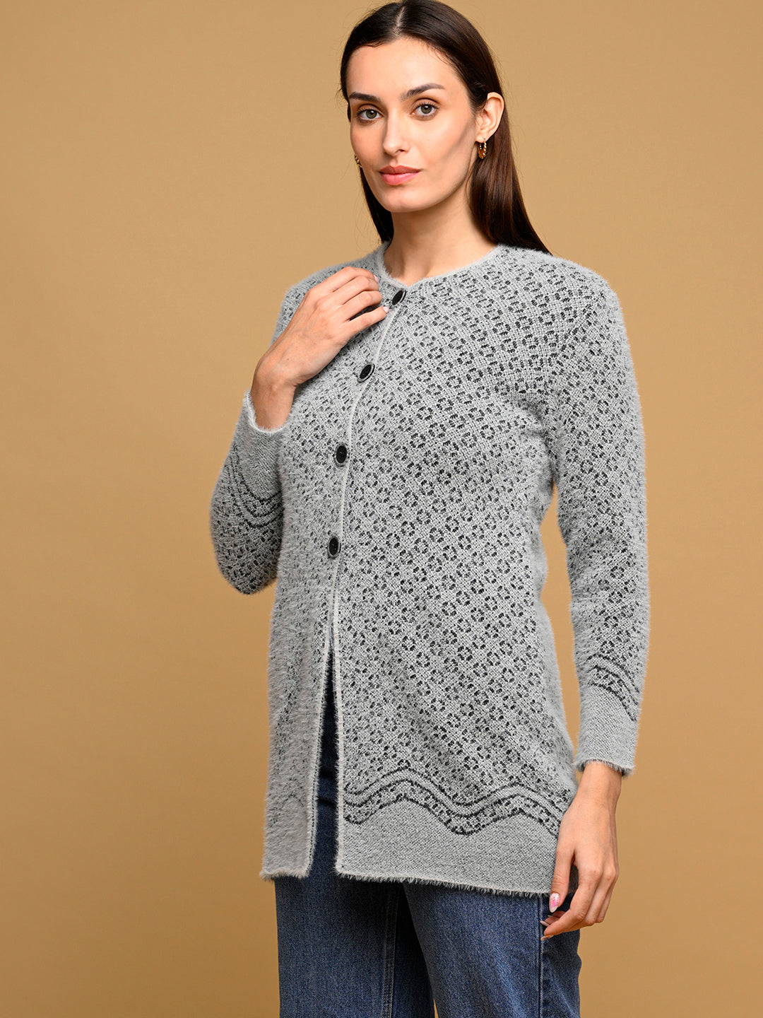 Wrap yourself in warmth and sophistication with the Virsa Elegance Jacquard Long Cardigan. Made from premium nylon wool, this beautifully crafted jacquard cardigan is perfect for winter's chill while adding a touch of elegance to your wardrobe. Featuring a round neck, button-down front, and full sleeves, it offers a regular fit that transitions seamlessly from casual outings to semi-formal events or evening wear. Whether layered over a dress or paired with trousers, this versatile cardigan ensures you stay chic and cozy, no matter the occasion.