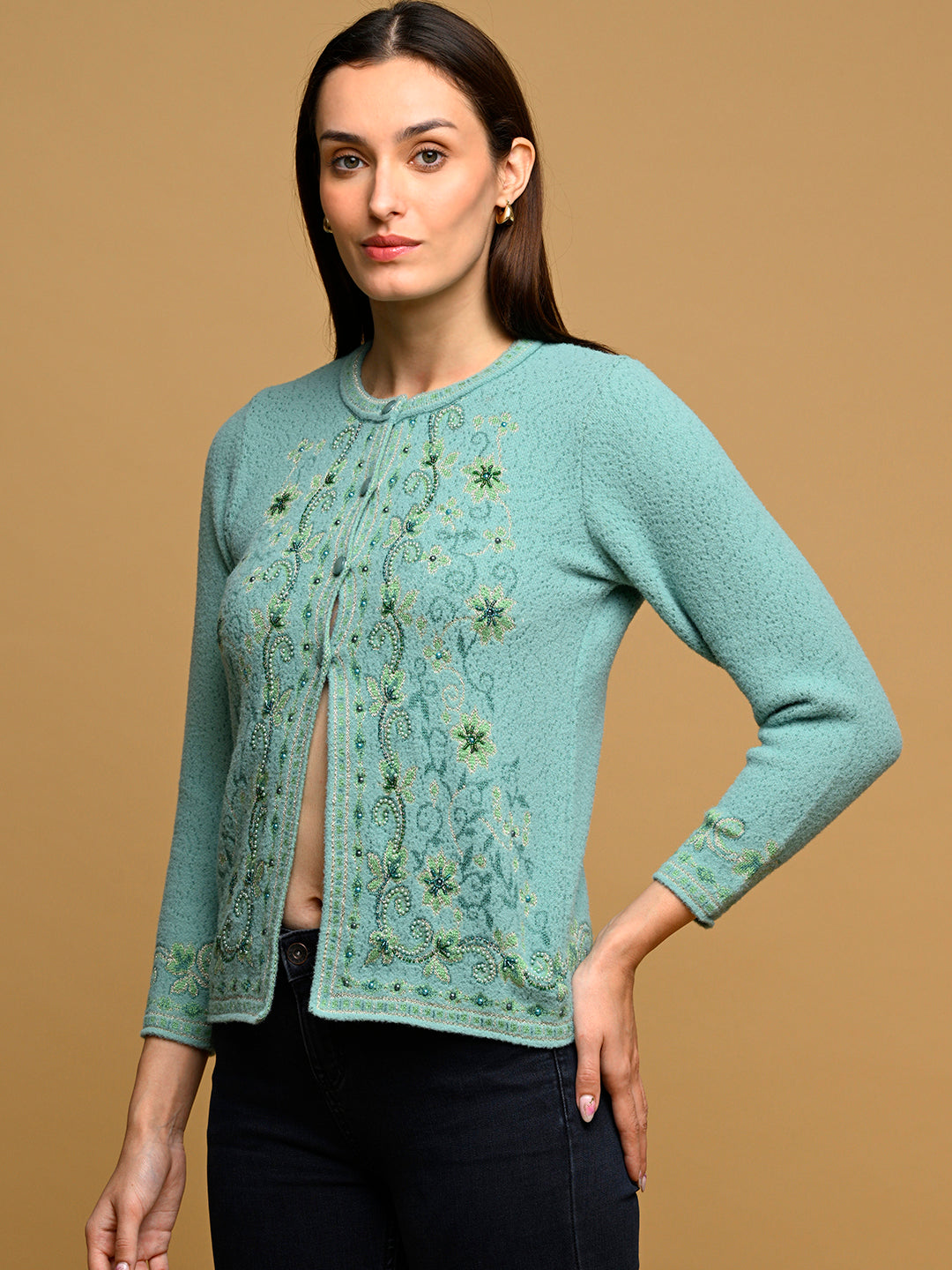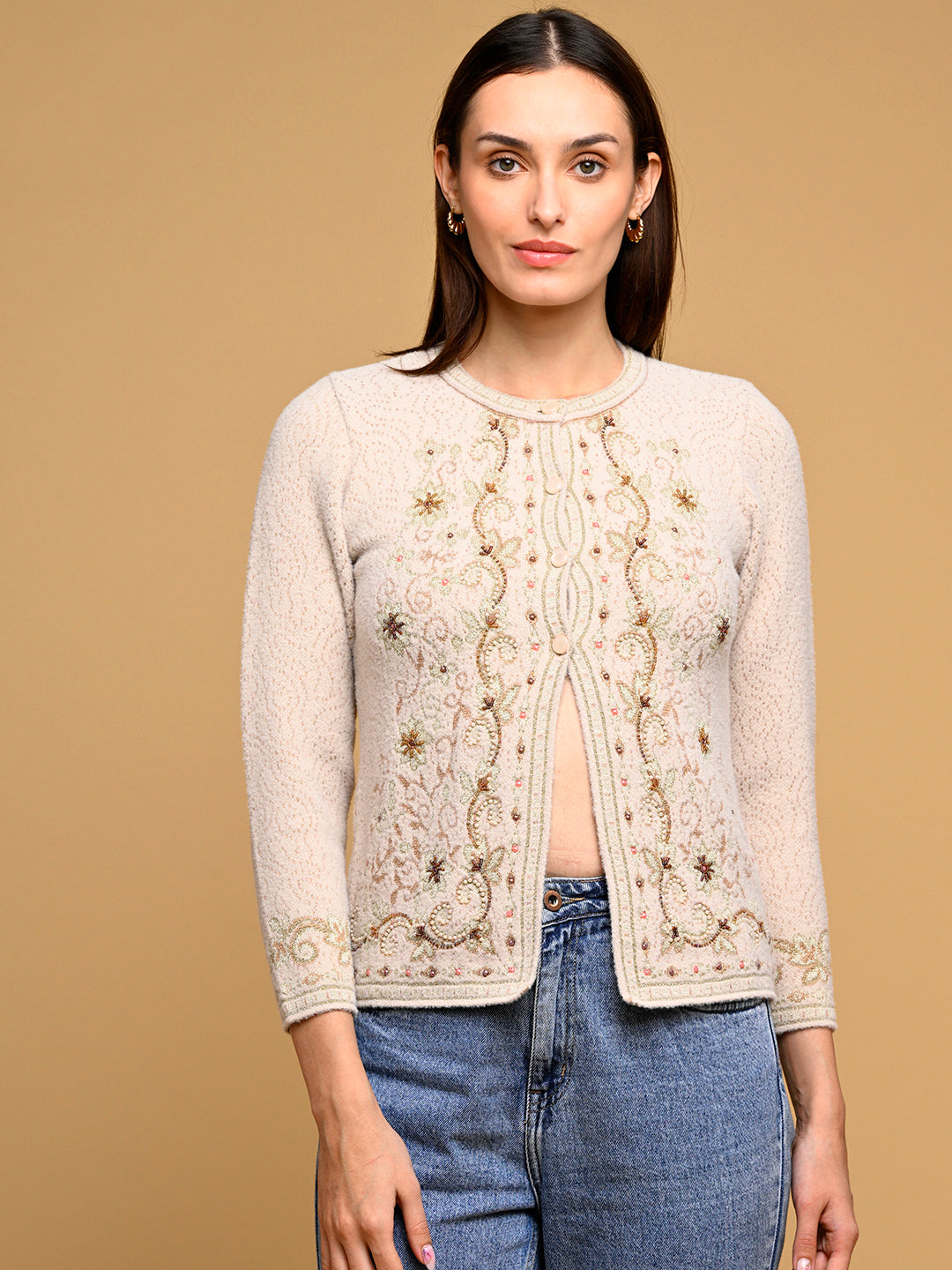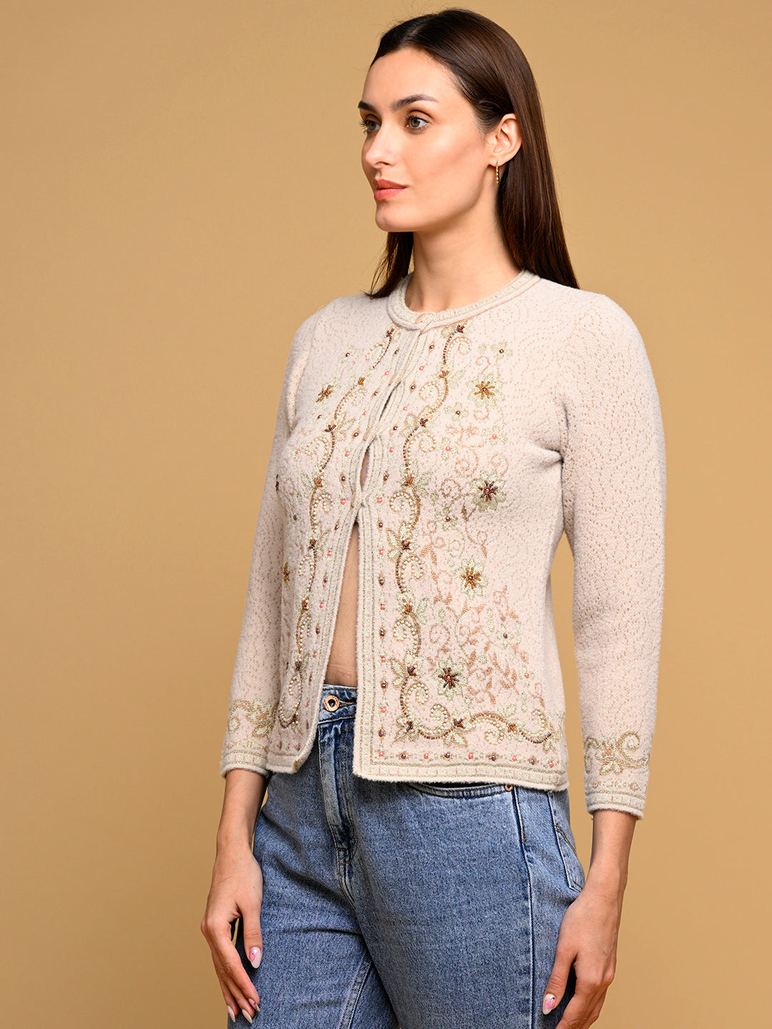 Make a bold statement with the Virsa Jacquard Party Cardigan. Crafted from premium nylon wool, this cardigan is designed to offer both warmth and style during the colder months. Featuring a round neck, button-down front, and full sleeves, it provides a regular fit that’s perfect for layering over your party wear. The jacquard design adds a touch of sophistication, making this cardigan the ideal choice for your next celebration or evening event. Stay chic and cozy while turning heads this winter season.