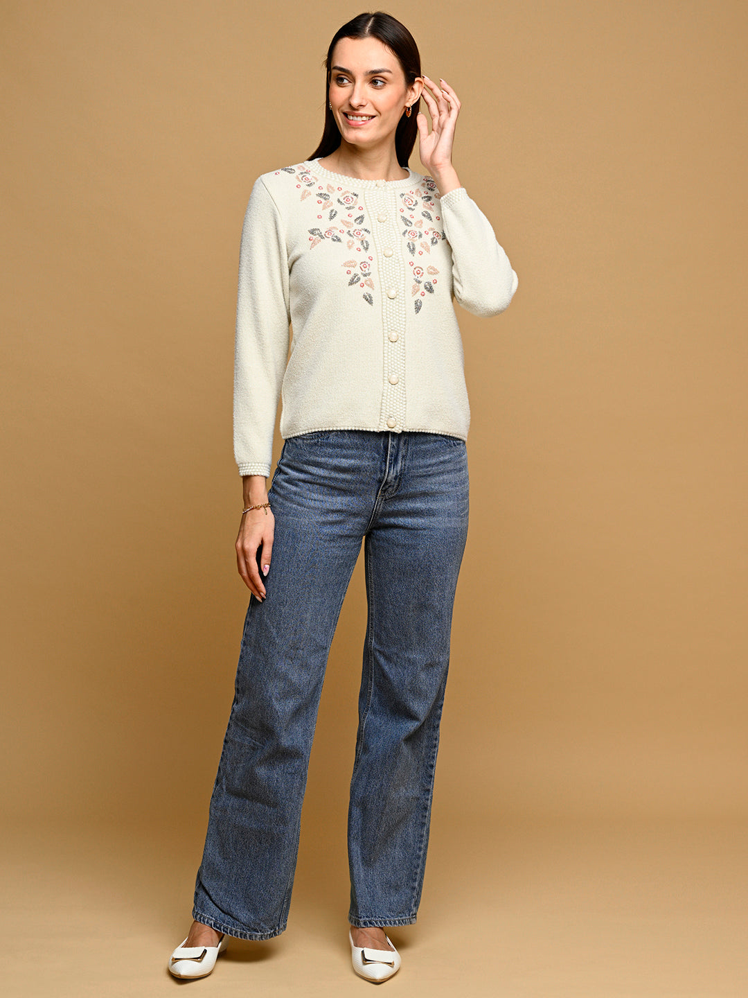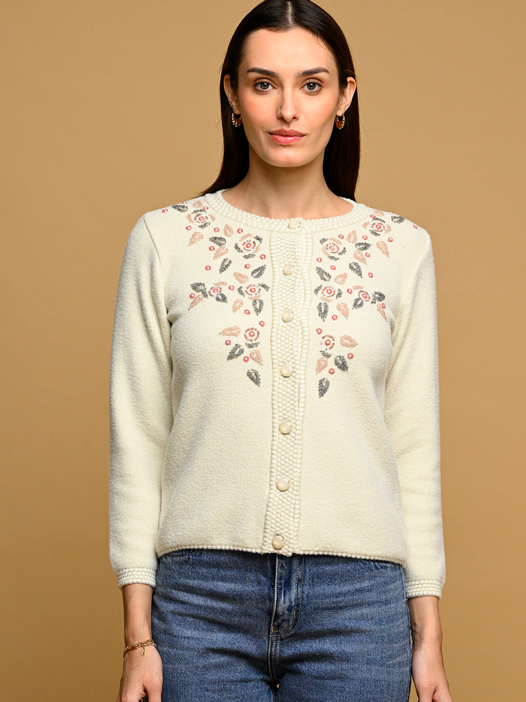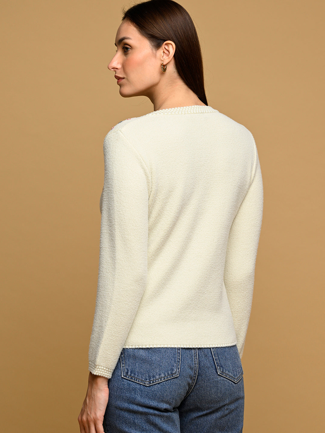 Elevate your winter evening wear with the Virsa Luxe Off-White Jacquard Party Cardigan. Made from premium nylon wool, this cardigan features a sophisticated jacquard design that adds texture and elegance to any party outfit. The round neck, button-down front, and full sleeves offer a regular fit that’s both flattering and comfortable. Perfect for layering over dresses or pairing with evening trousers, this off-white cardigan effortlessly blends style and warmth, ensuring you shine through every festive occasion.