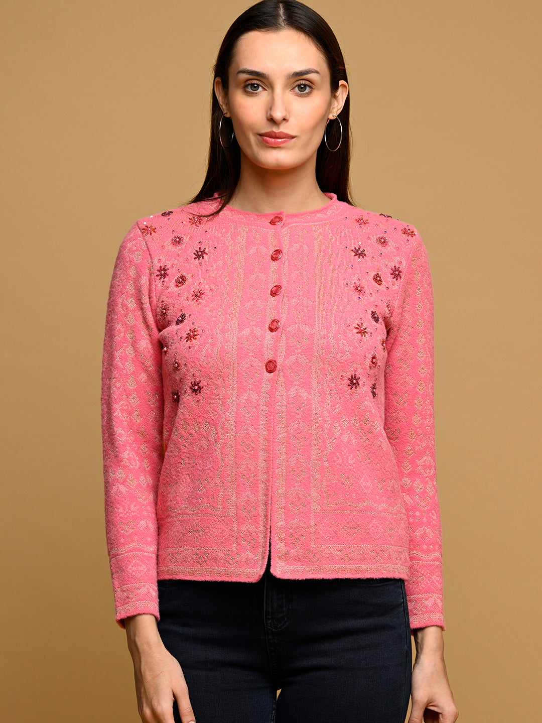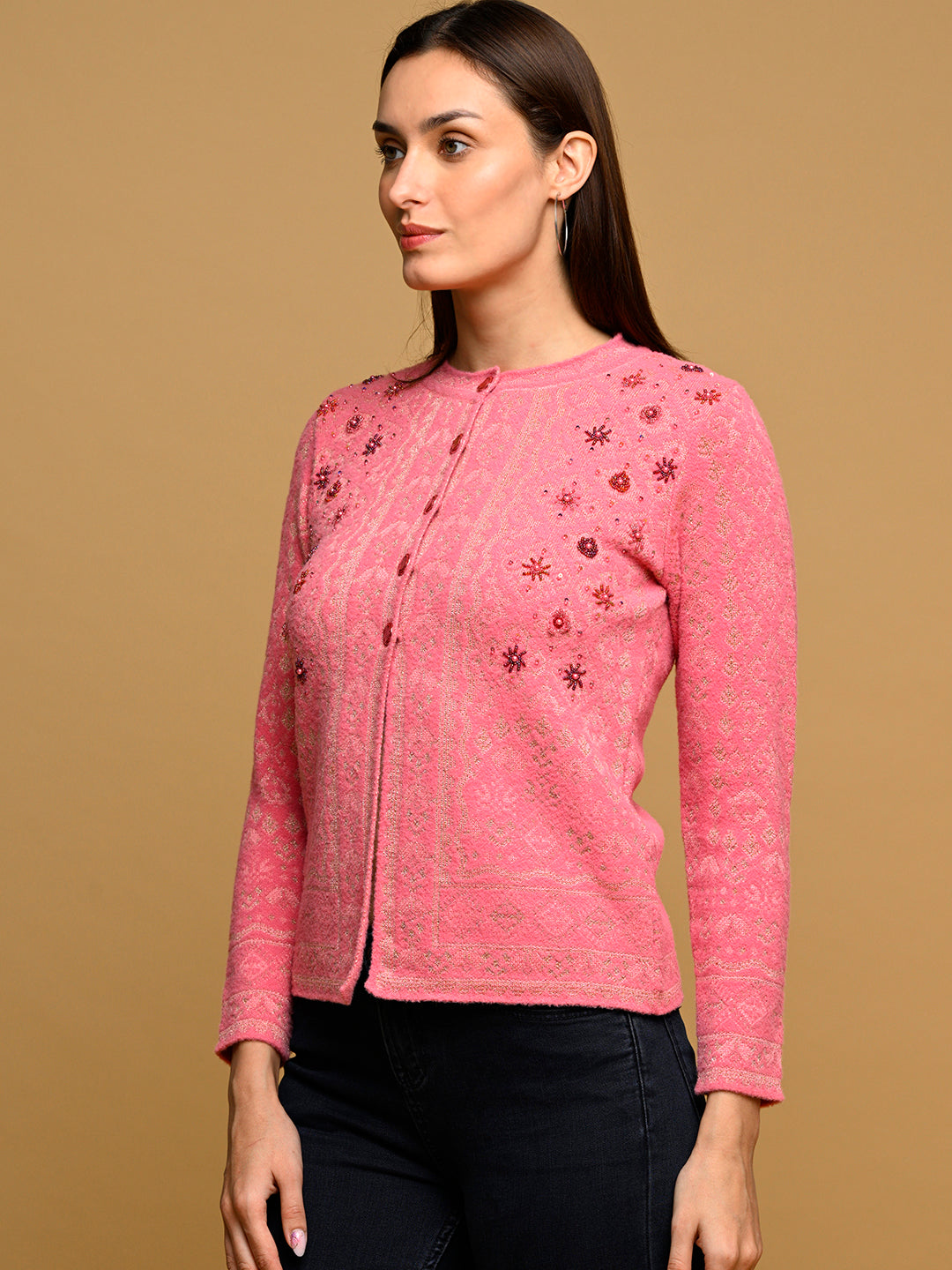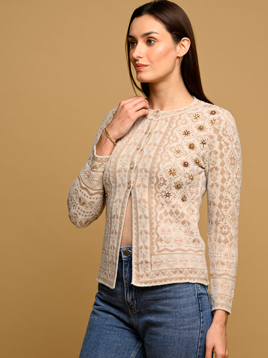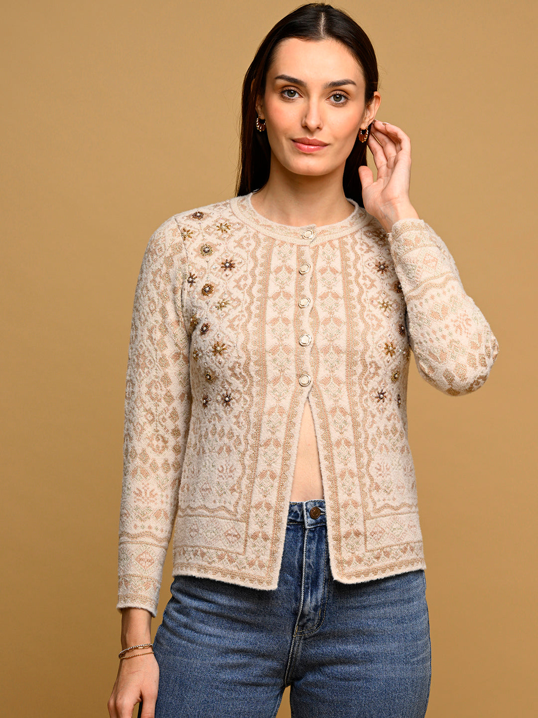 Make a stylish statement this winter with the Virsa Luxe Jacquard Party Cardigan. Made from premium nylon wool, this intricately designed jacquard cardigan offers both warmth and elegance for any party occasion. Featuring a round neck, button-down front, and full sleeves, it provides a regular fit that flatters your silhouette while keeping you cozy. Perfect for layering over your evening wear or pairing with chic outfits, this cardigan adds a touch of luxury and sophistication to your party wardrobe.
